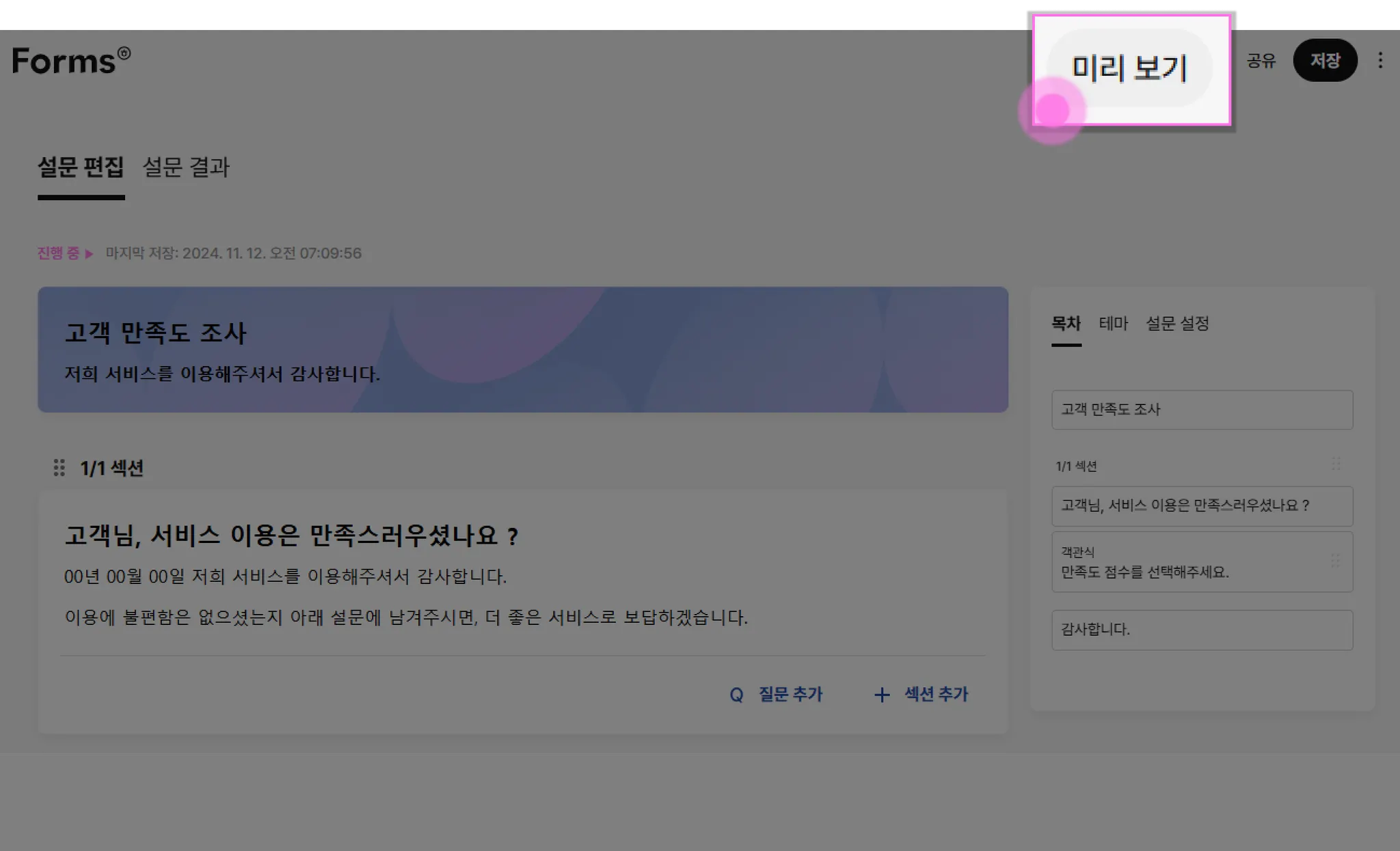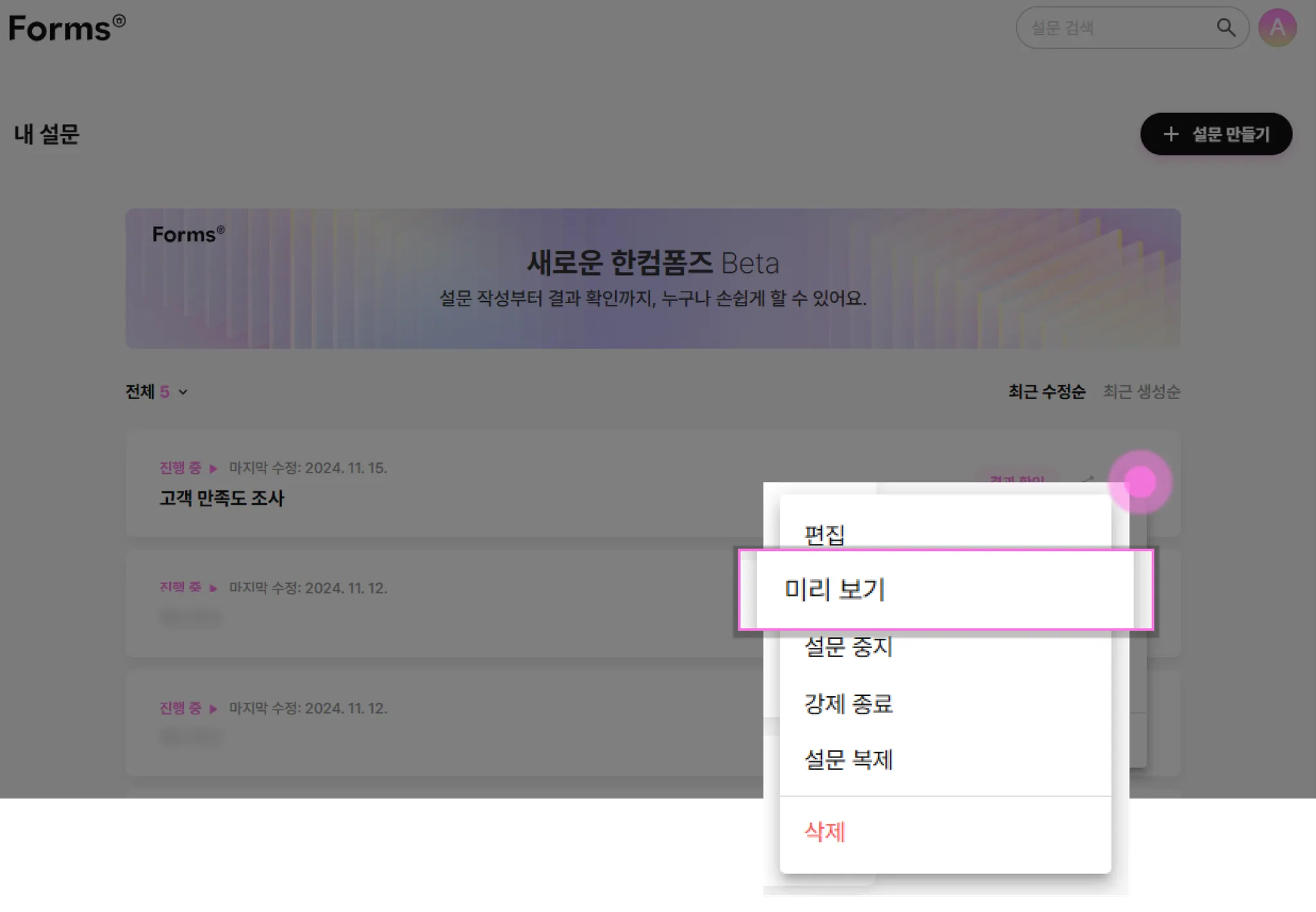 미리보기는 설문 편집 화면이나 설문 리스트에서 확인 가능합니다.